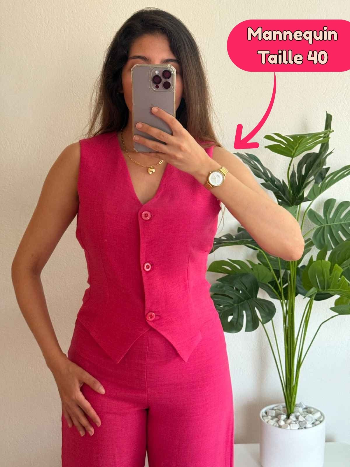 Succombez à l'élégance décontractée de cet Ensemble 2 Pièces en Kamraya (ou tissu similaire) de haute qualité. Parfait pour le printemps et l'été, son design combine légèreté et chic pour sublimer votre silhouette en toute occasion. Le look est composé d'un Gilet ajusté (coupe cintrée, encolure en V) et d'un Pantalon Palazzo (taille haute, jambes larges) dans une Couleur Fuchsia Tendance qui illumine le teint. Confectionné dans une matière naturelle et respirante, cet ensemble est idéal pour le bureau, les sorties ou les événements. Lavage délicat à 30°C. Livraison rapide en Tunisie et en France. Conseil style : Associez-le à des sandales fines ou des escarpins nude pour un look raffiné.